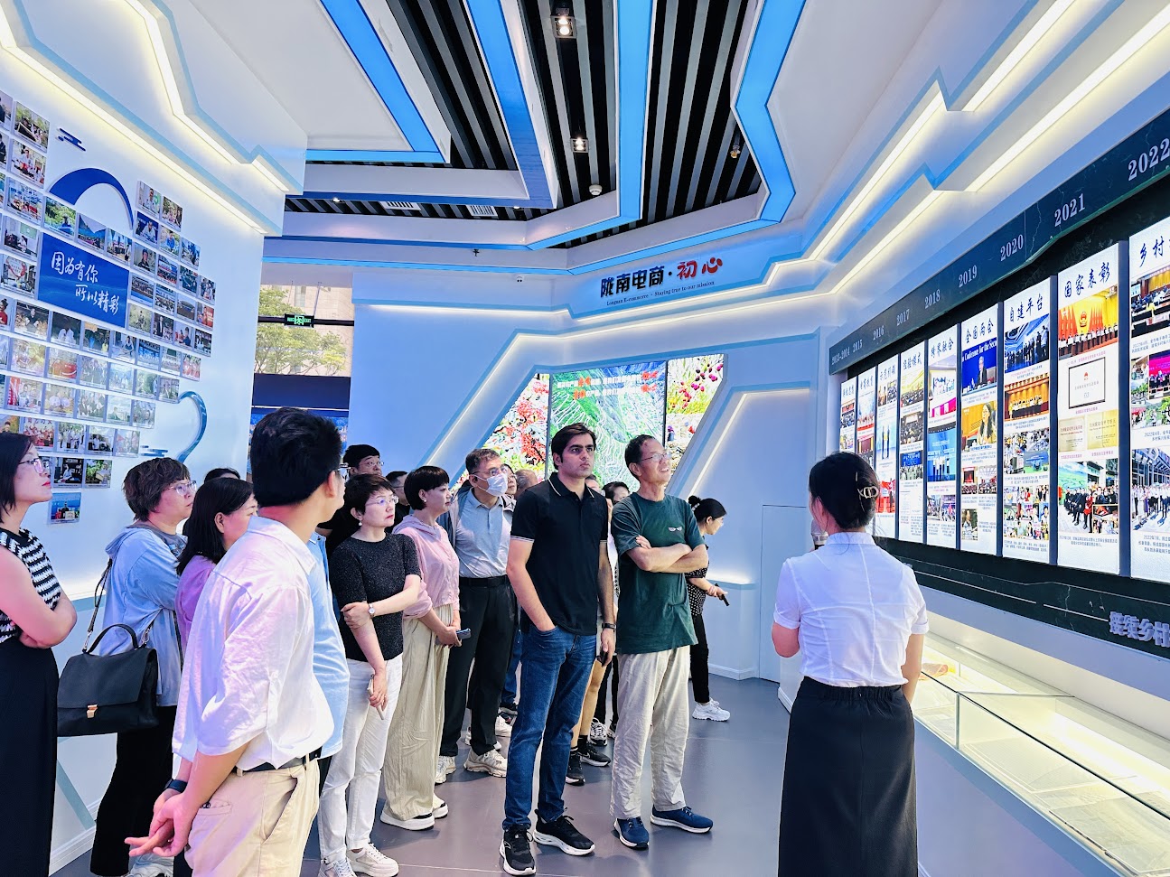Our subsequent stop was the Longnan E-commerce Service Center, overseen by Wang Xue. Established in 2020, the center has been recognized as a National Poverty Alleviation Exchange Point. It is a composite facility that integrates retail, service incubation, and data analytics. The first floor serves as a showcase for the history of e-commerce development, online goods, data analytics, and local distribution. The second floor is a service hub offering MCN incubation, talent training, cross-border e-commerce, packaging, legal services, and third-party operations. The third floor is dedicated to e-commerce theory research and the nurturing of leading local e-commerce enterprises. Our visit illuminated the concept of 'one county, one industry,' hinting at its scalability across other regions.