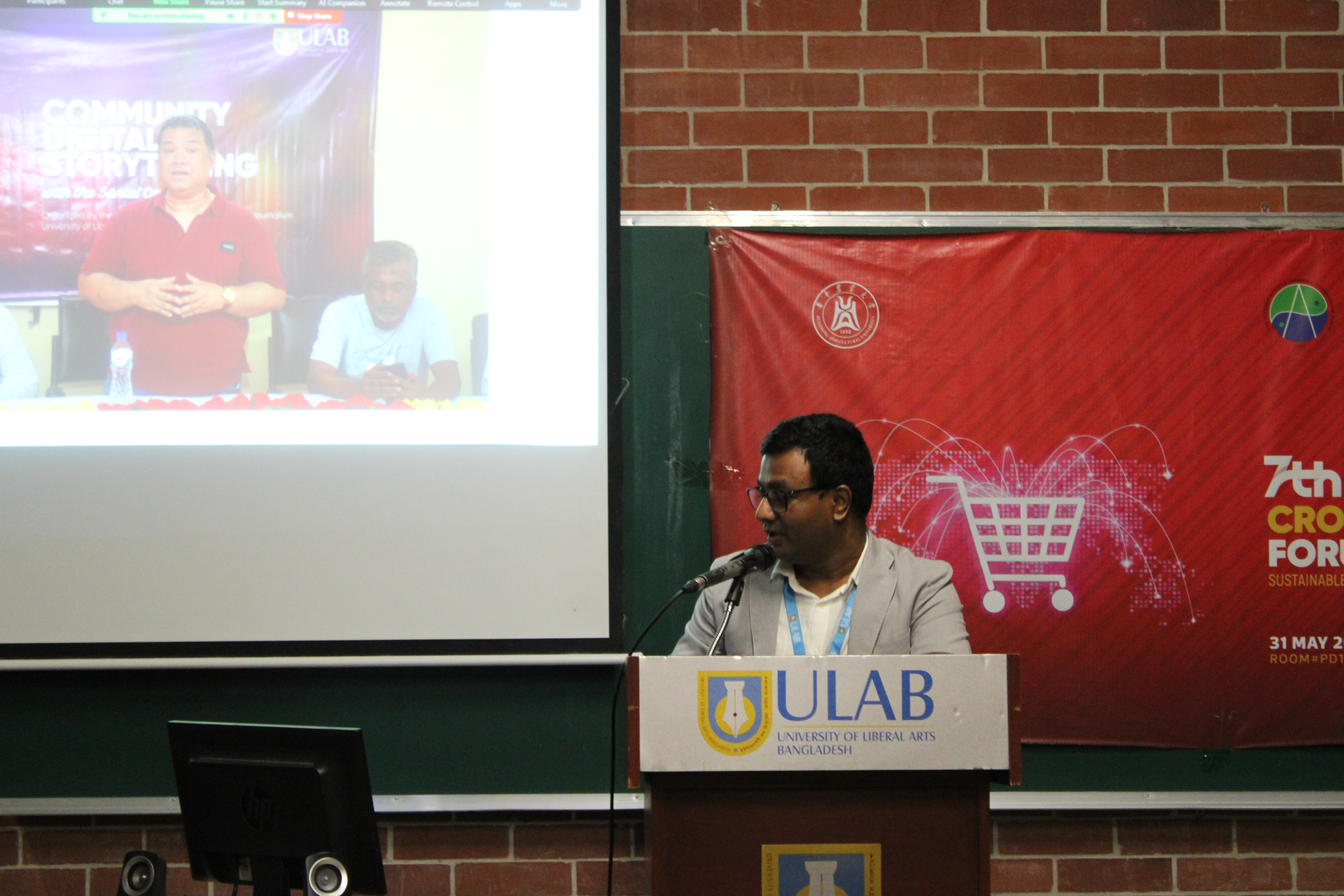 Dr. Kader Muhammad, a faculty member from the Department of Media Studies and Journalism at ULAB, presented the progress report on the micro-finance project in Bangladesh, which is being implemented in conjunction with the Community Digital Storytelling (CDS) project. He began by providing an overview of the CDS project, explaining that it involves visiting remote areas in Bangladesh and training local community members in digital storytelling techniques using cameras, mobile phones, and other available technology. The aim of the project is to empower these individuals to tell their own stories, express their needs, and share their experiences in their own way.