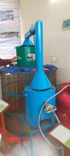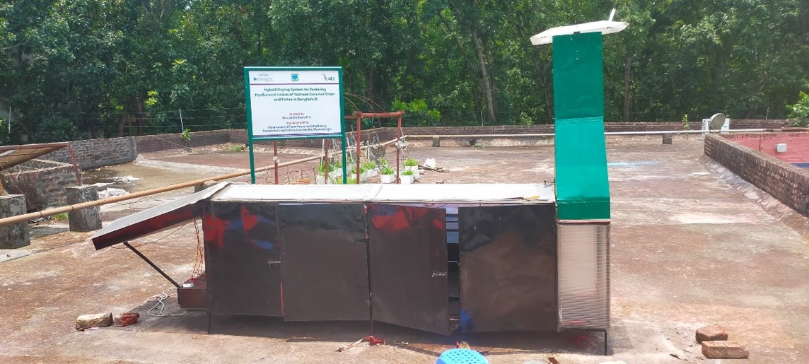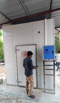 Visit to the fabrication lab/ agri. machinery lab: Fabrication of different agricultural machinery was done in the Department of Farm Power and Machinery. The team was received in the department by Professor Chayan Kumer Saha and was taken through the postharvest loss reduction innovation laboratory. There were different fabrications mainly dryers to dry cereals and vegetables like eggplant, onions among others in smallscale and also other small agricultural machineries like harvester were noted. A cooler being used for smallscale cooling was observed and there were mangoes which had been in storage for 3 months. The department also had cutters including 3D for designing e.g. door names, cups, key holders among others. A solar based irrigation system was also noticeable and these activities had received external funding e.g. from Feed the Future.